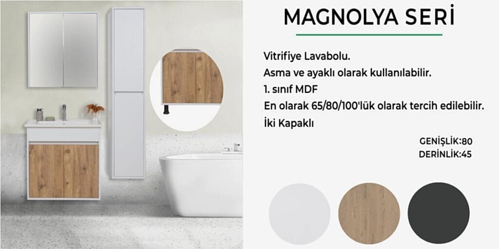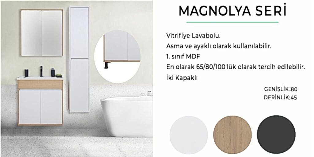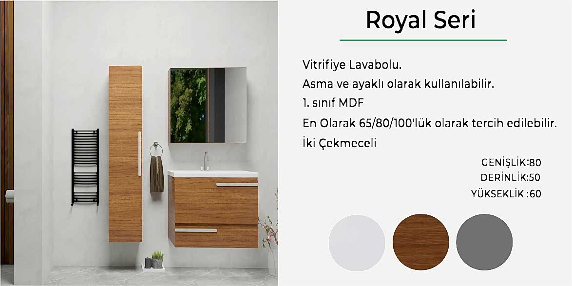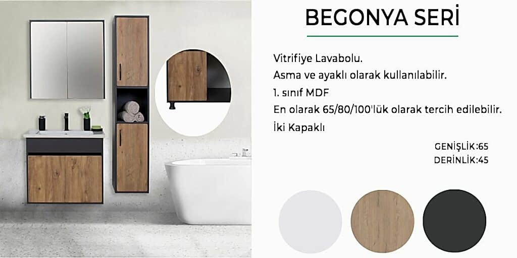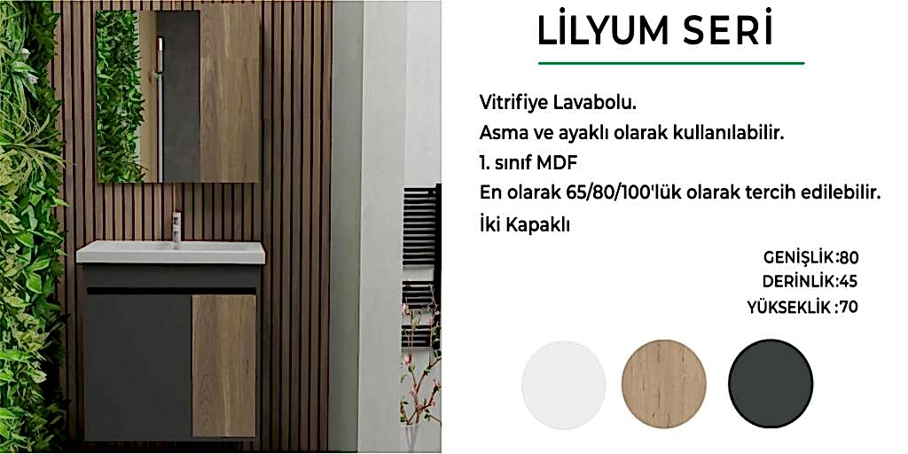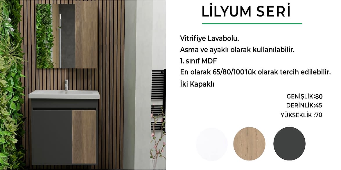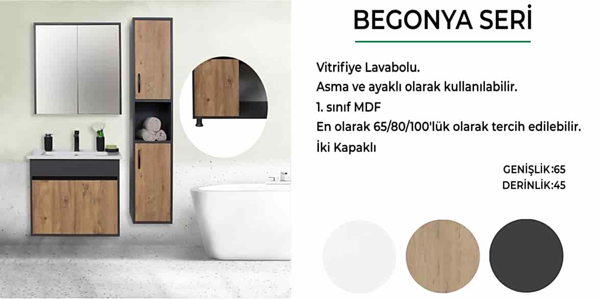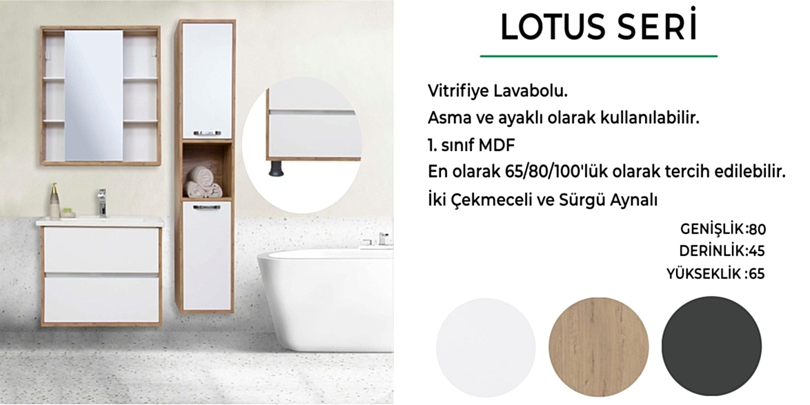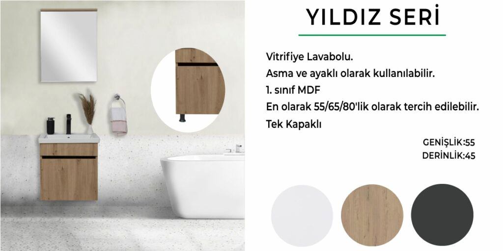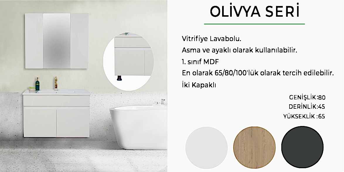 Firmamızda üretilen Banyo Dolapları E1 normundaki 1. Kalite MDF’ den üretilmektedir. Banyo Dolaplarımızda kullanılan tüm aksesuarlar paslanmaz olup standart veya özel üretim şeklinde yapılabilmektedir. Aynı şekilde minifix sistemli veya vidalı olacak şekilde üretim yapılabilmektedir. Kullanılan kenar bantları 1mm olup PVC den mamuldür. Üretimde kullanılan tüm makinalarımız yeni olup en iyi markalardan oluşmaktadır. Sitemizde gördüğünüz standart Banyo Dolaplarımız dışında özel olarak tasarlanmış dolaplarımızda bulunmaktadır. Dolaplarımızda kullandığımız vitrifiye lavabolar 1.Kalitedir. Banyo alt dolaplarımız gizli kulplu veya metal kulplu ve çekmeceli olarak üretilmektedir. Üst dolaplarımızda kullandığımız aynalar 1.sınıf olup tamamıyla bizotelidir.
