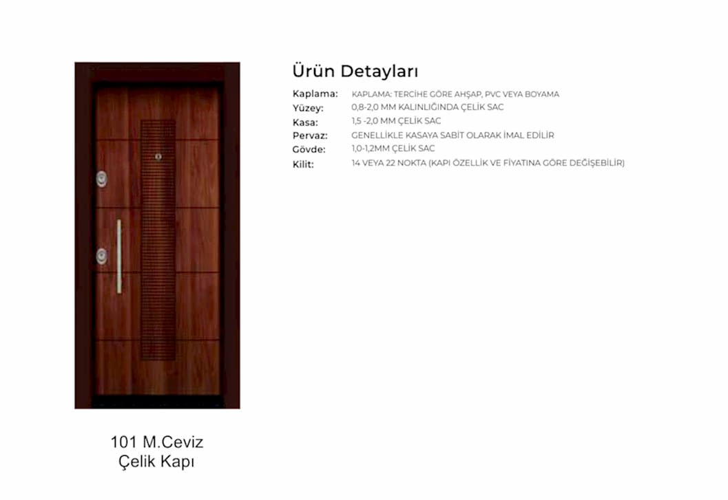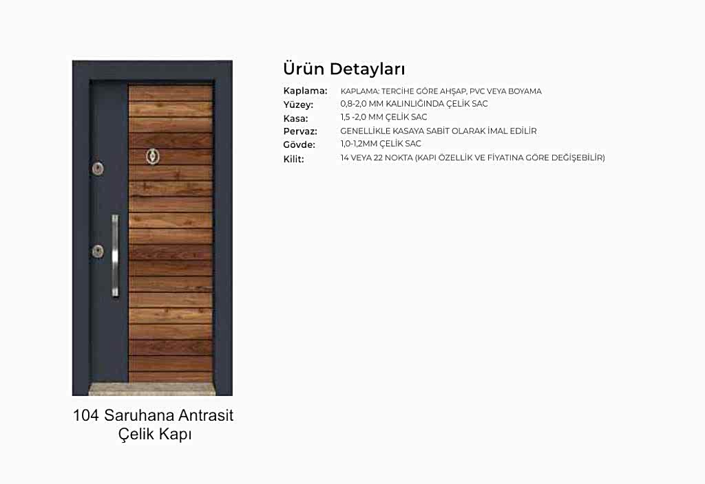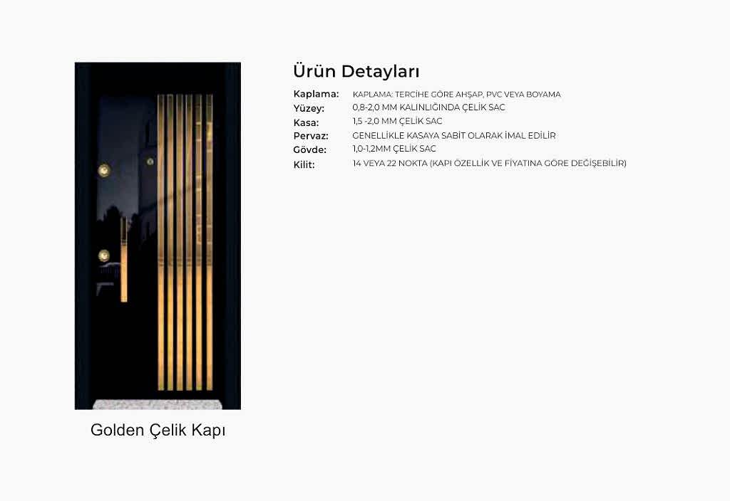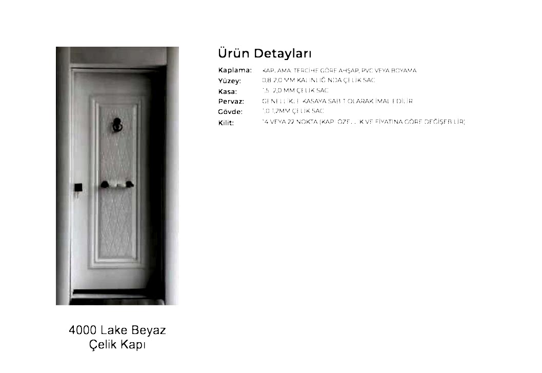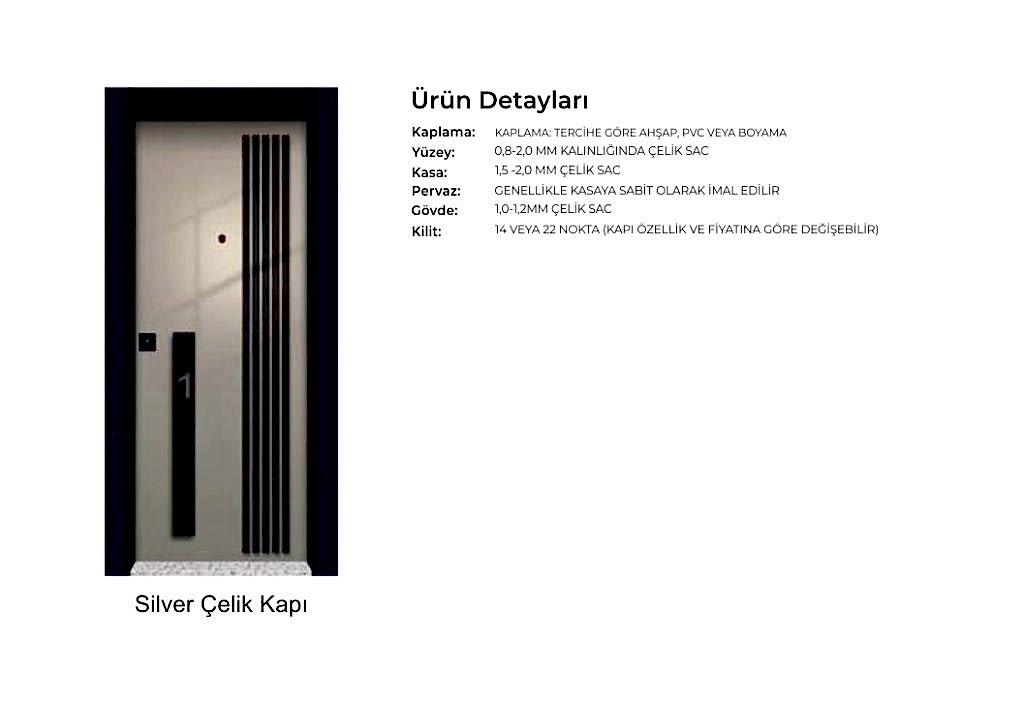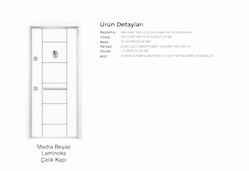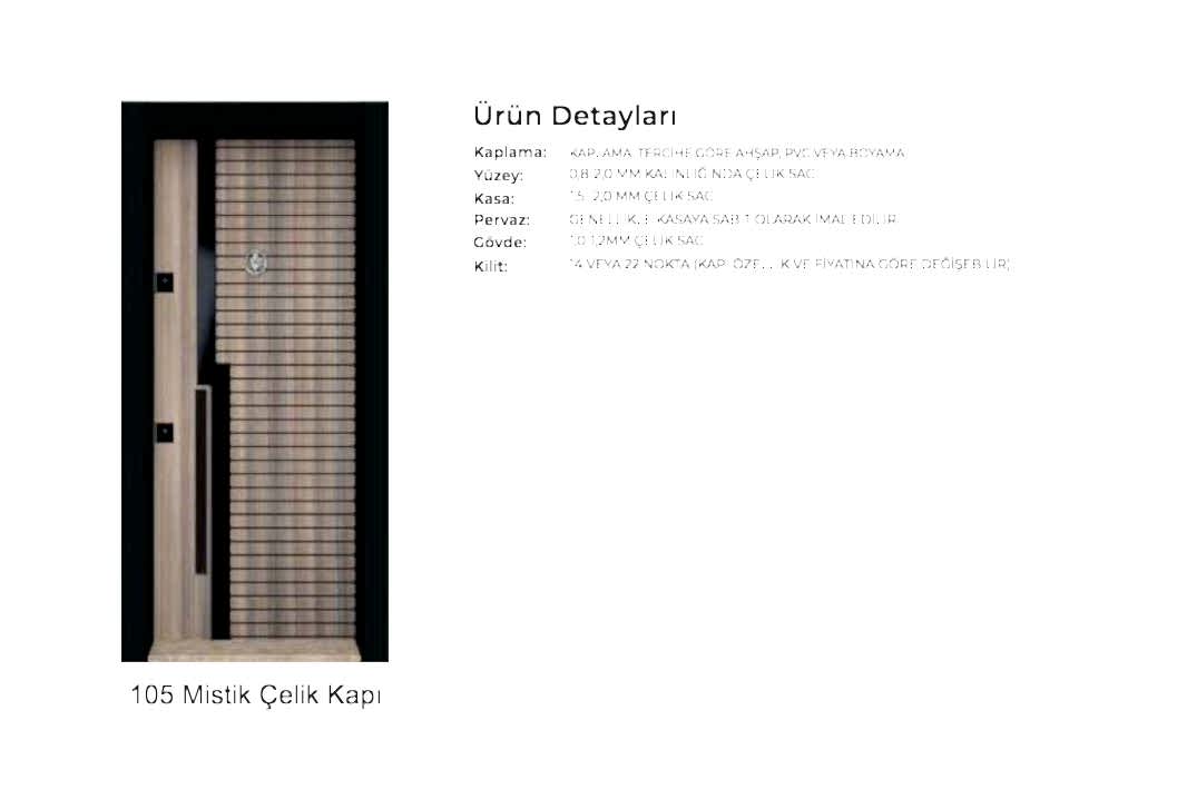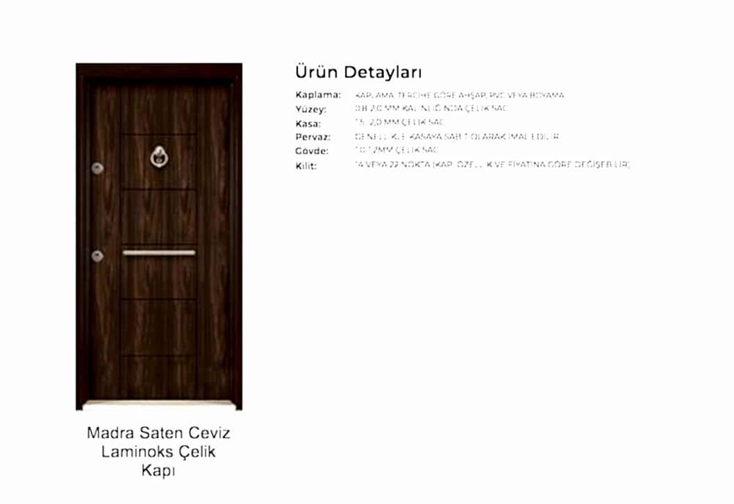 - Kapılarda standart olarak kaliteli malzemeden 180 derece dürbün, kapı kolu kullanılır. Farklı renk ve tip aksesuarlar opsiyonel olarak uygulanmaktadır.