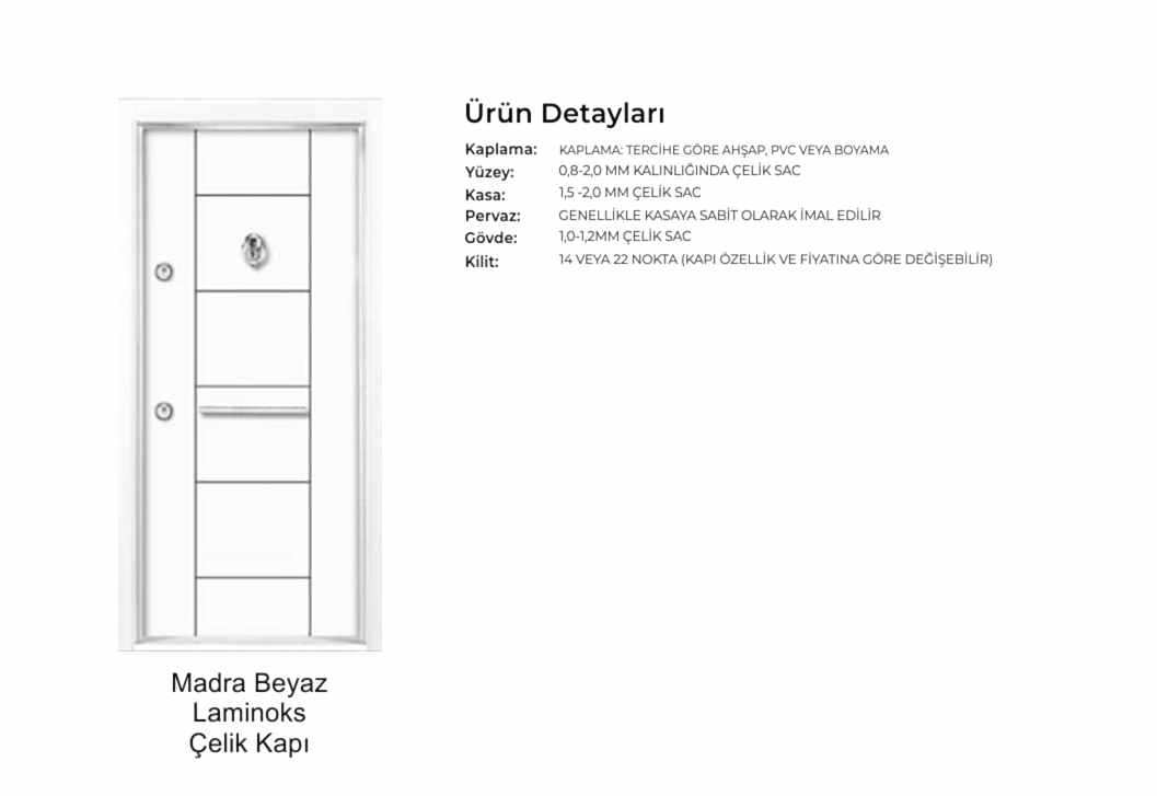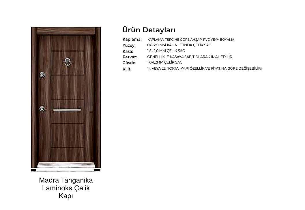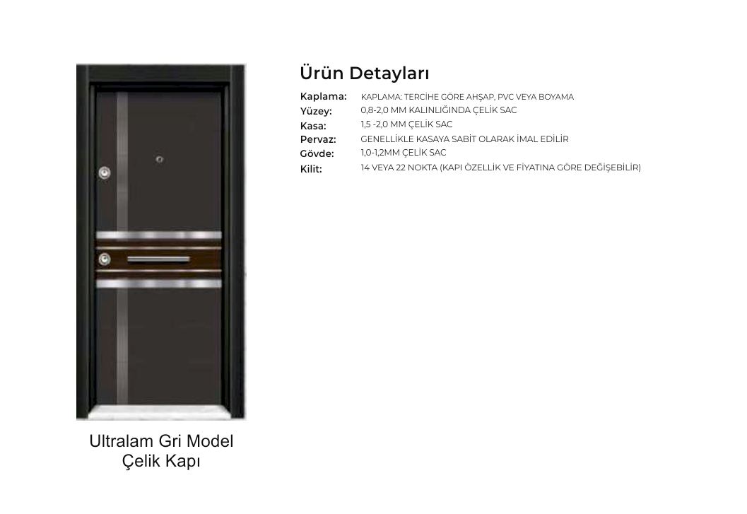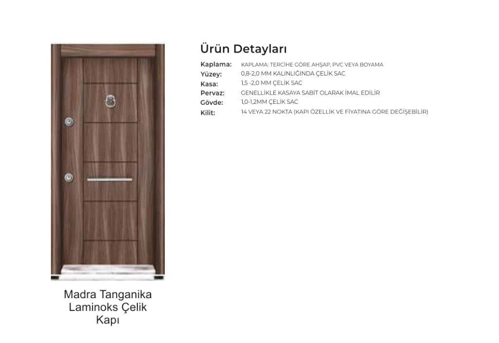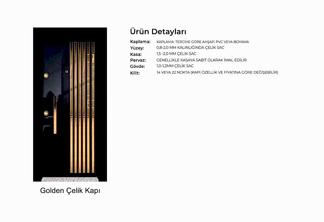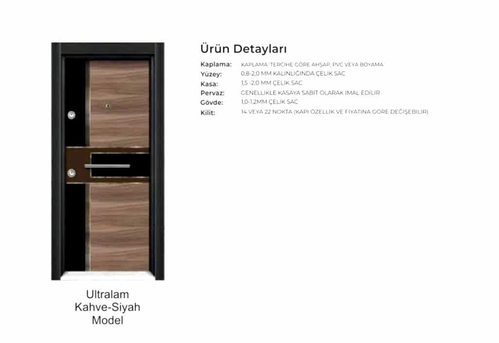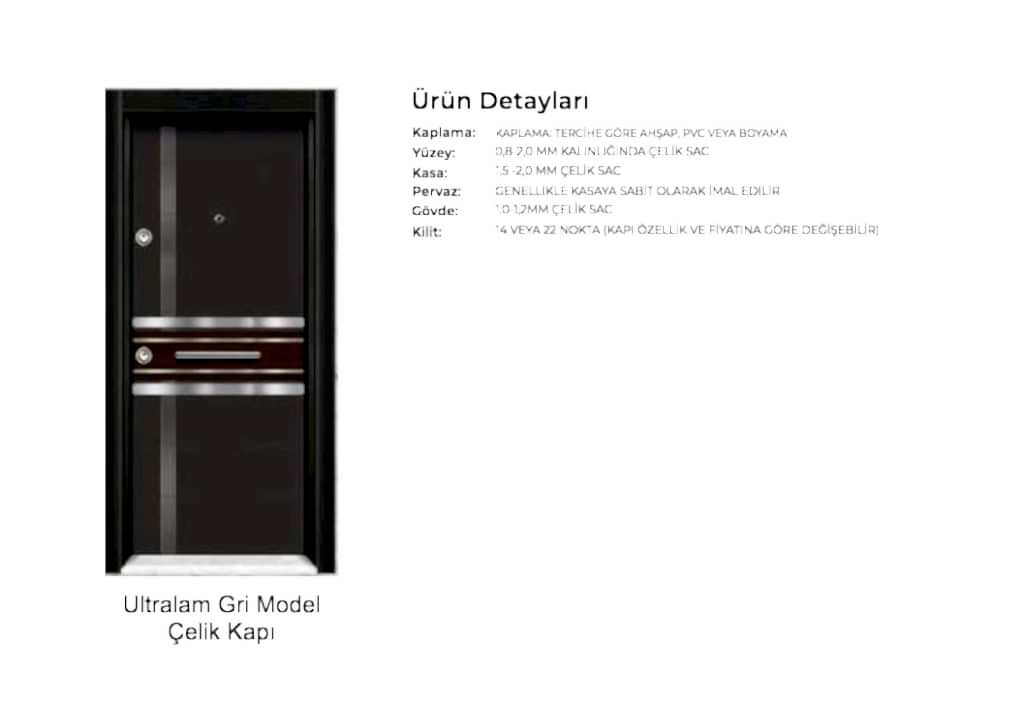 - Kapı serenleri 1.5 mm kalınlığında profilden, güvenlik noktalarında 6.5 mm kalınlığa ulaşan niteliktedir. Kanat içi 0,70 mm sac ile desteklenmiştir.